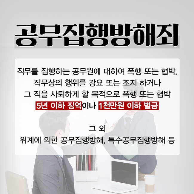 국정을 담당하는 일을 업으로 하고 있는 공직자는 비교적 안정적이고 노년이 되었을 때 보호받는 직업이기 때문에 다수의 인물들로부터 선망받는 직업이라고 했습니다. 이런 공직을 수행하고 있는 경우에 이를 방해하는 행위를 하면 영업방해죄가 아닌 ‘공무집행방해죄’로 엄한 처벌을 선고하겠다고 했습니다. 사회에 나가서 업무를 하다 보면 매번 상황마다 사건화되기도 하는데 대부분 긍정적 방향으로 수습된다고 했어요. 다만 한계를 넘어선 물의로 발현될 경우 공동체적인 눈치를 볼 수 있는 곤란한 상황이 될 것이라고 했는데요. 그 중에서도 공무를 수행하는 공직자에게 폭행 또는 협박, 욕설을 할 경우 불법행위가 성립하고 공무를 수행하는 공무원을 보호하기 위해 본법이 생겼다고 했습니다.